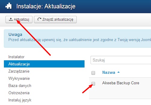 Joomla aktualizuje się jednym kliknięciem. Gdy dostępne są aktulizacje dodatków, na spisie wybierz wszystkie dodatki i kliknij "Aktualizuj"