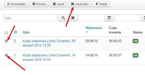g. Usuń pliki kopii z serwera. Na liście kopii, zaznacz wszystkie kopie, a następnie kliknij "usuń pliki"